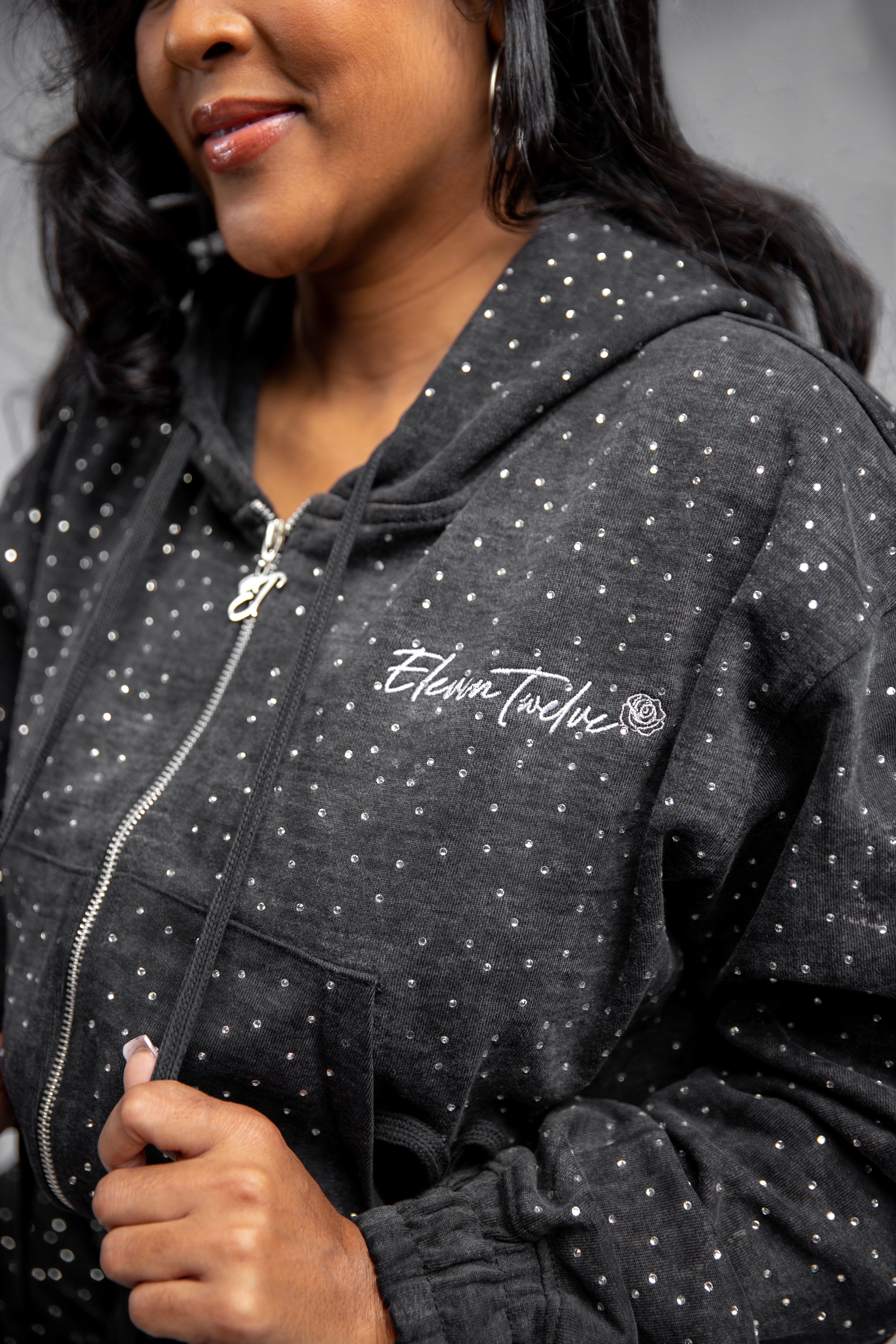 Each piece is acid-washed for a unique finish. Variations in color, wash, and rhinestone placement are intentional and not considered defects.